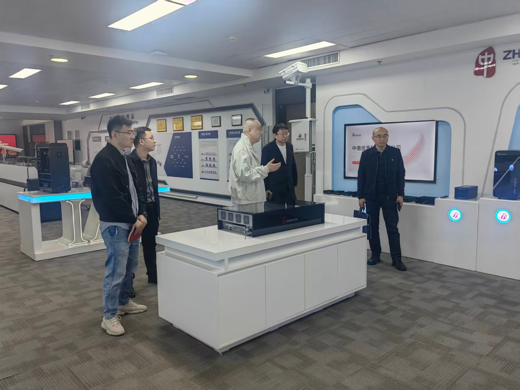 一行在公司负责人徐琪的陪同下实地参观了企业研发中心和技术展示区,详细了解企业的核心技术产品、应用场景及未来发展规划。中南科技依托鲲鹏打造了智慧停车解决方案,推出云、边、端一体化综合解决方案,具备对客户的全栈服务能力,在智慧园区管理和城市数字化转型方面积累了丰富经验。