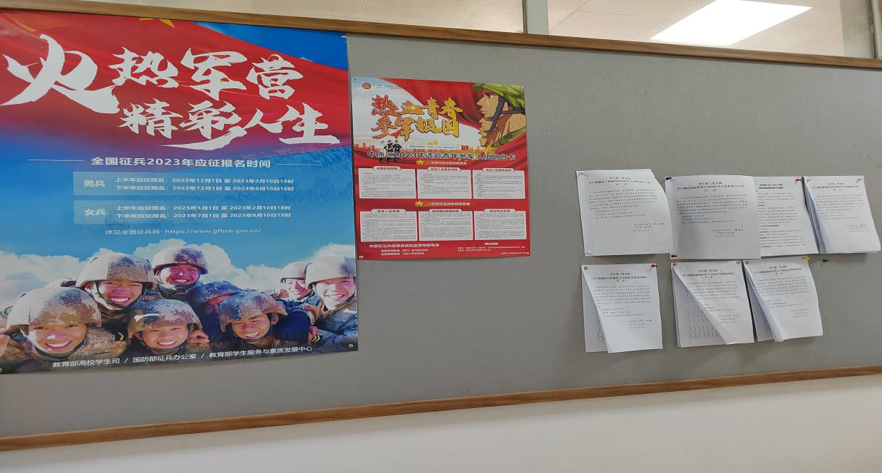在六号楼附近重要区域张贴了征兵宣传海报,展示了征兵时间安排、基本流程和一年两次征兵的保障政策;宣传展板,通过一幅幅图片和一段段文字,突显中国人民解放军发展历程,让青年学子更加懂得新时代幸福生活的来之不易,自觉凝聚起报国强军的强大力量。黑料不打烊