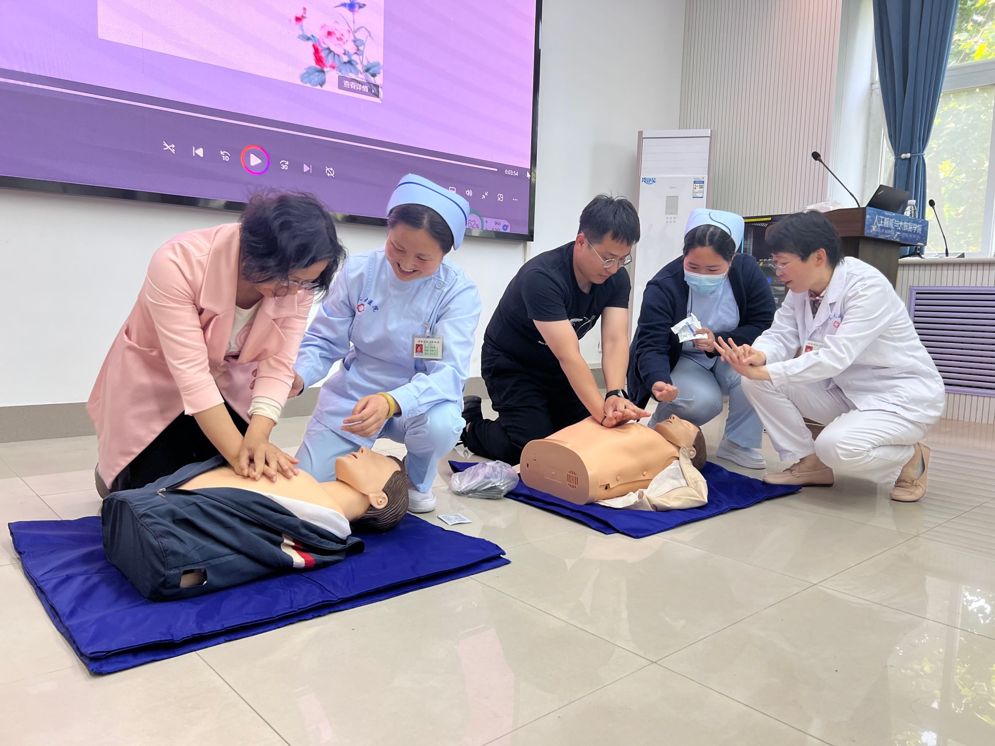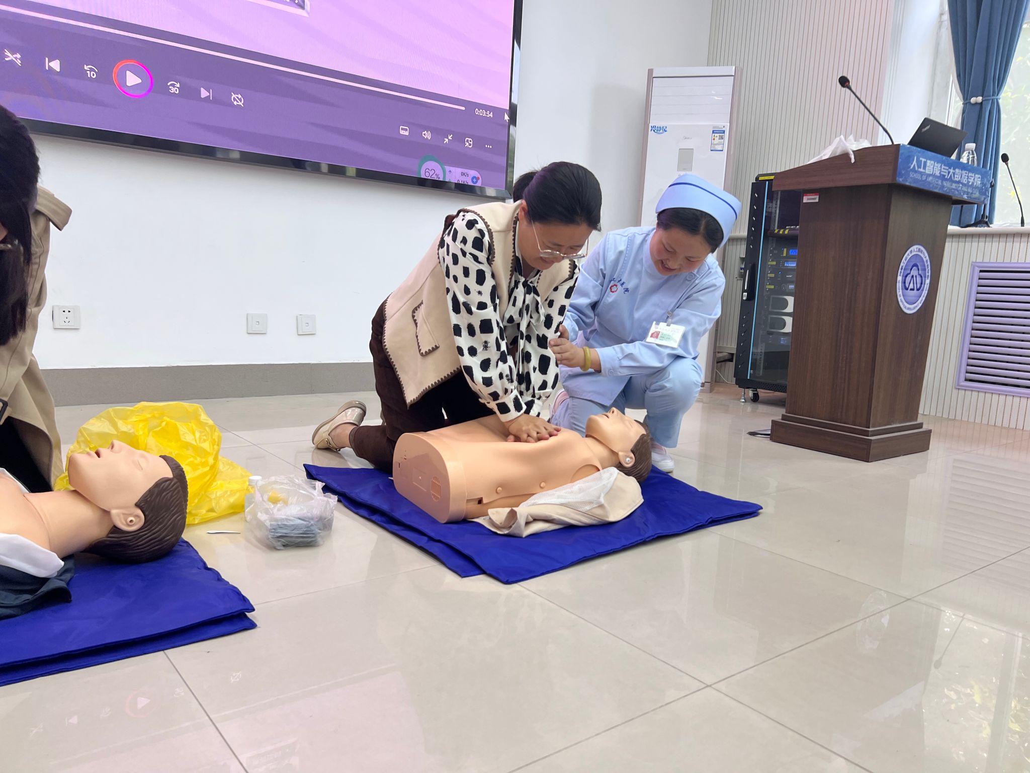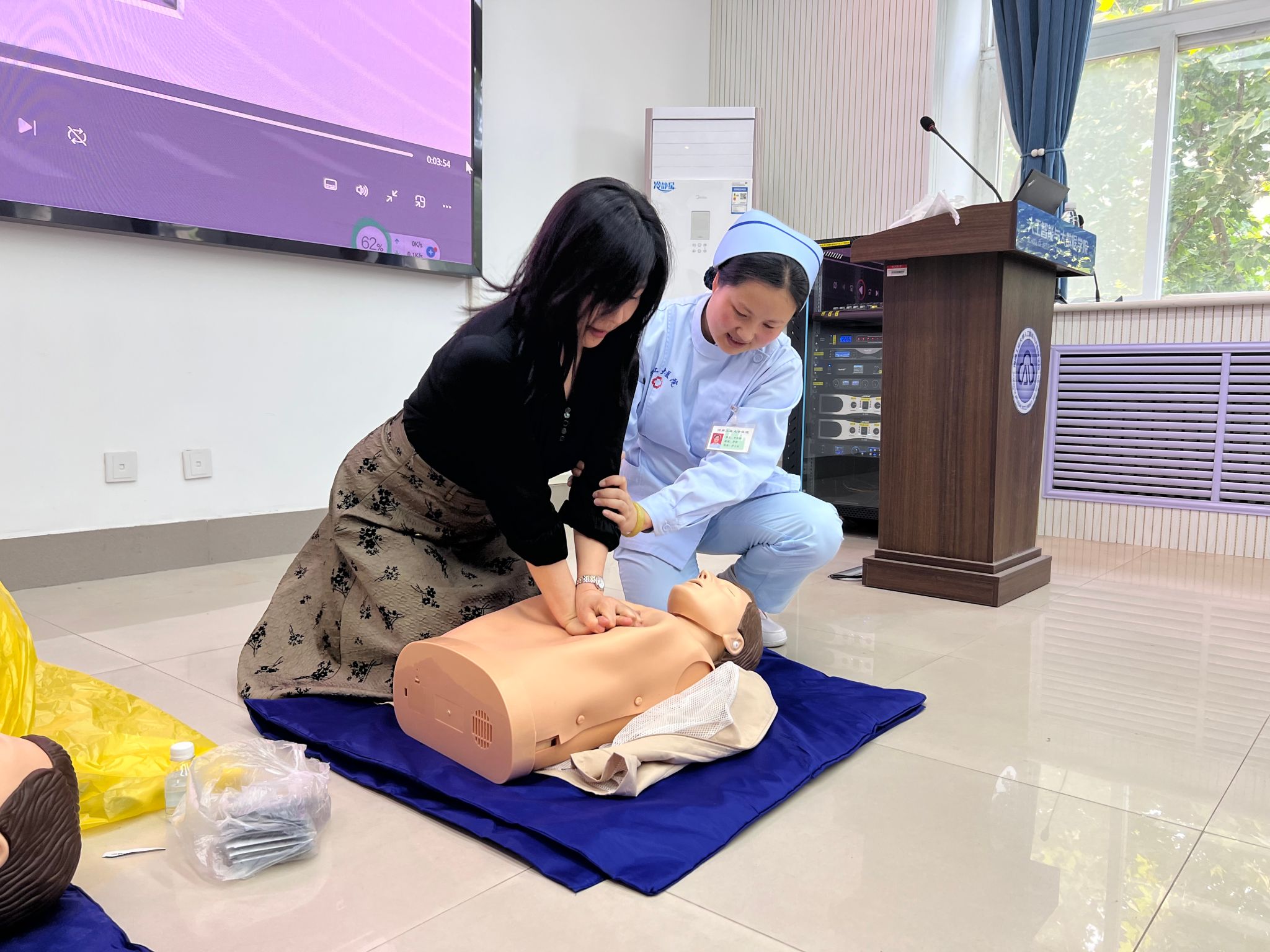 陈辉老师首先通过身边各种真实的病例向大家讲授了多项实用的急救护技能,包括心肺复苏、中暑、低血糖的处理、烫伤处理以及运动损伤等各种急救方法。其次,她通过视频讲解向大家详细介绍了心肺复苏及海姆立克急救法的具体操作方式。最后,医护人员用模拟人教具为大家边示范边讲解心肺复苏的整套操作流程。在实操培训过程中,医护人员亲自指导教职工进行实践操作,并对操作中不规范、不到位的地方进行一一指正。
