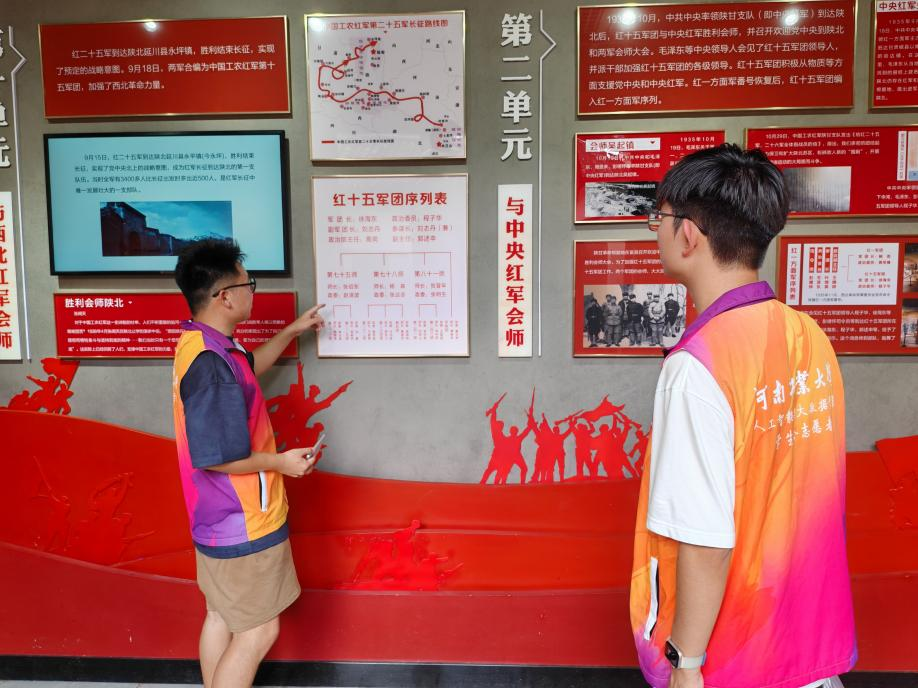 途中,一段生动的红色故事分享会在展厅中悄然进行。两位团队成员并肩站在一面挂满历史图片的墙壁前,他们的目光凝视着墙上的每一张照片,其中一位成员,手指轻轻划过一张展现程子华将军英明决策的图片,用沉稳而充满敬意的语调,缓缓讲述起将军如何在关键时刻力挽狂澜,引领红二十五军踏上长征的征途。