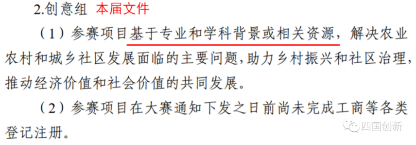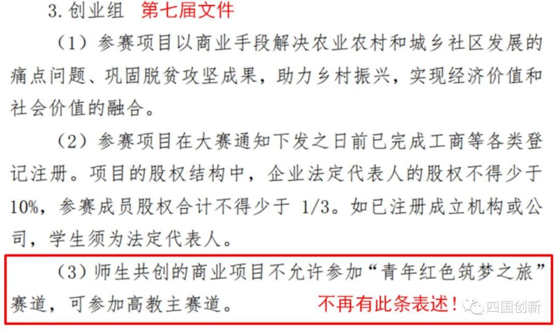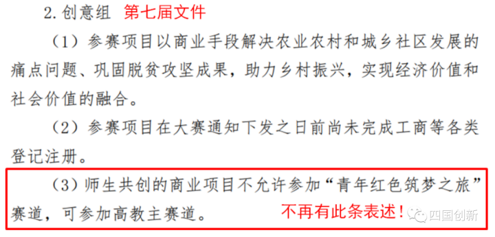 今年大赛明确取消了高教主赛道的师生共创组,鼓励学生成果参赛。而我们也注意到,在红旅赛道中,取消了关于“师生共创项目不能参加本赛道”的表述,而明确表示可以“基于专业和学科背景或相关资源”参赛。这样的变化意味着学校的、学科的成果可以明确拿来参加红旅赛道的创意组和创业组比赛。这也消除了之前在评审实际中关于项目成果是否为“师生共创”的评判标准的一些争议,消除了人与项目的违和感。相信在之后发布的评分标准中,也会与通知文件有相一致的表述,即鼓励高校和学科成果在相关方面的转化落地。