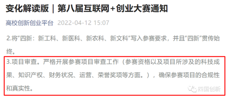 首先,大赛通知发布第一时间即有平台发布了相关变化解读。例如“高校创新创业平台”公众号412日发布了题为“变化解读版——第八届互联网+创业大赛通知”的解读。其中的第三条即提及此变化,并将此变化定义为“严格开展参赛项目审查工作”。