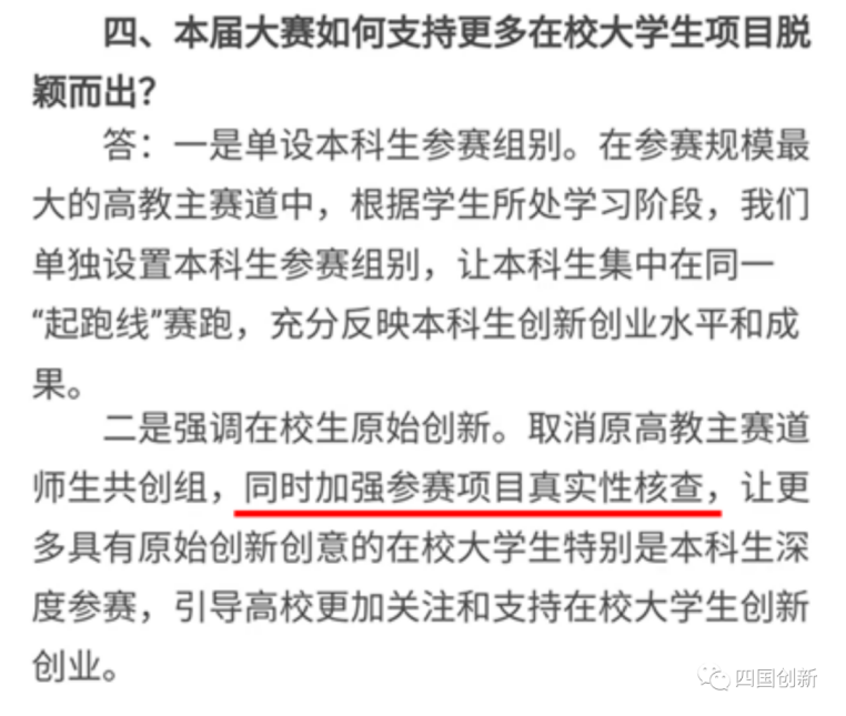 首先,在4月12日教育部官网发布的《教育部高等教育司负责人就<教育部关于举办第八届中国国际“互联网+”大学生创新创业大赛的通知>答记者问》中,在第四点中明确提到,要“加强参赛项目真实性核查”。这可以视为官方对于加强核查的正式而明确的表态。