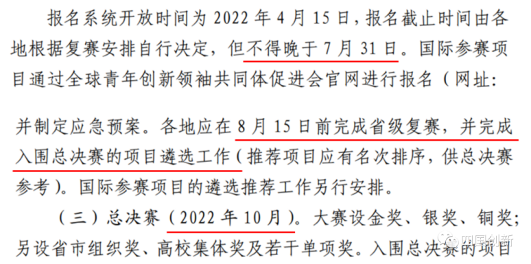 进而,在大赛通知文件中,在总决赛时间仍为10月的情况下,今年要求报名截止时间和各省省赛截止时间均较去年均提前了15天的时间。这个时间也很有可能是为了在国赛阶段对项目开展进一步的审查、复核及相关问题的处理而准备的预留时间。我们猜测这个审查可能是大范围的抽查,亦或是针对所有项目。被查出问题且存在问题比较严重的项目也很有可能被采取实质性的处理措施。