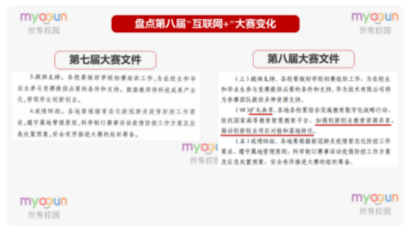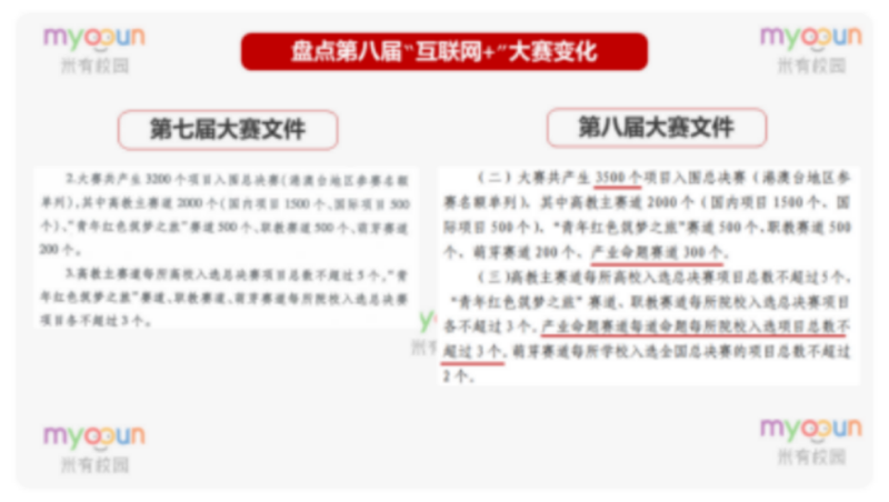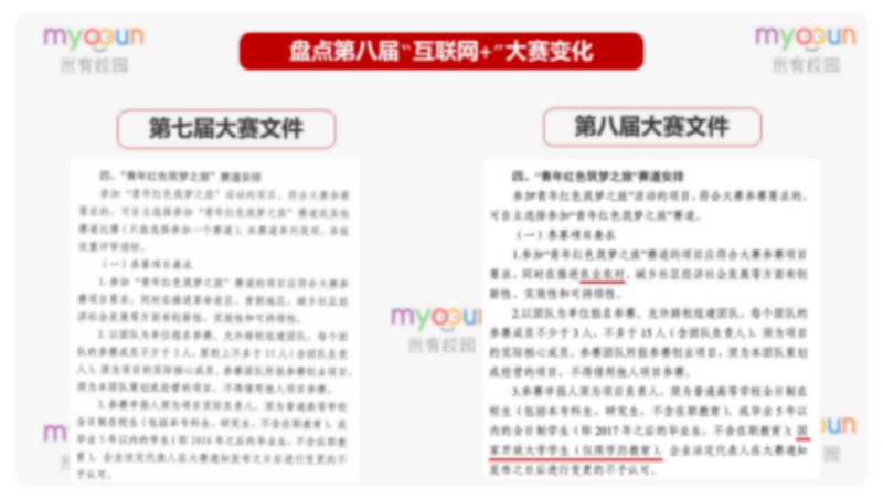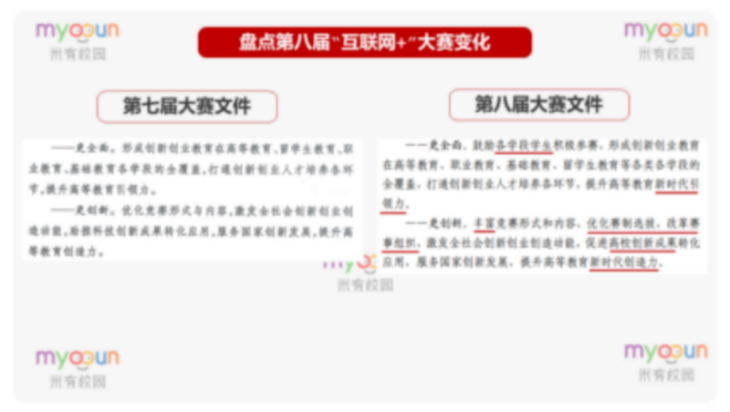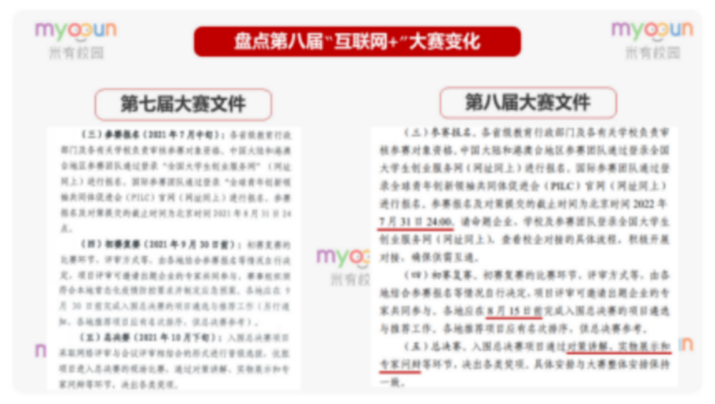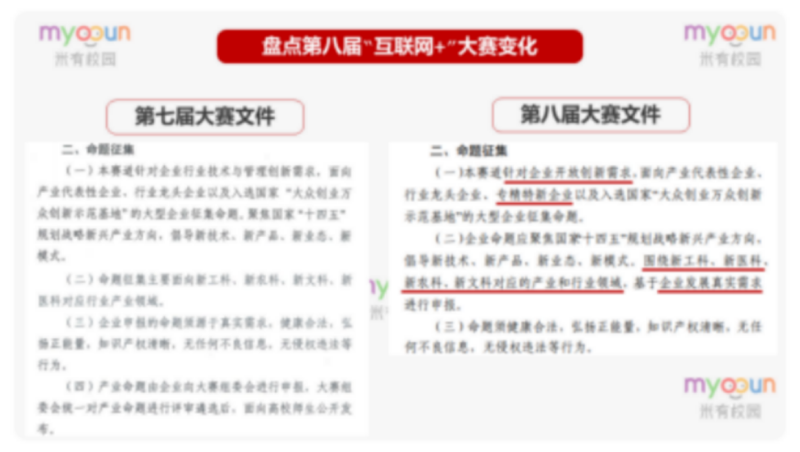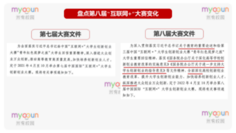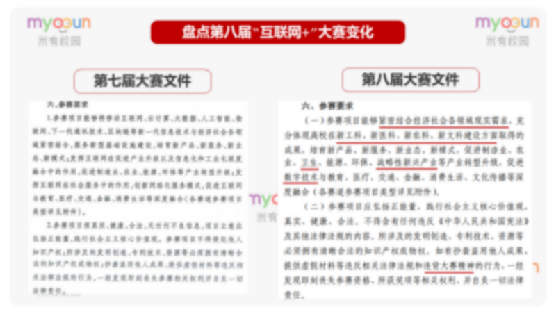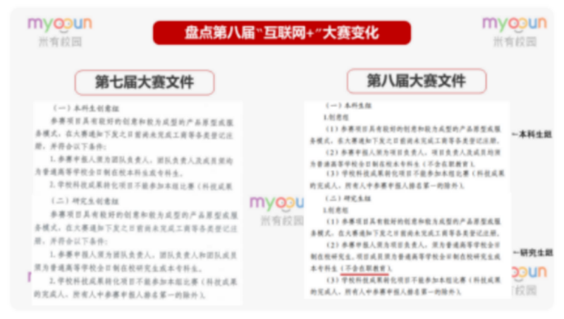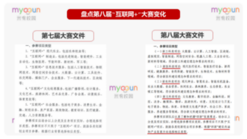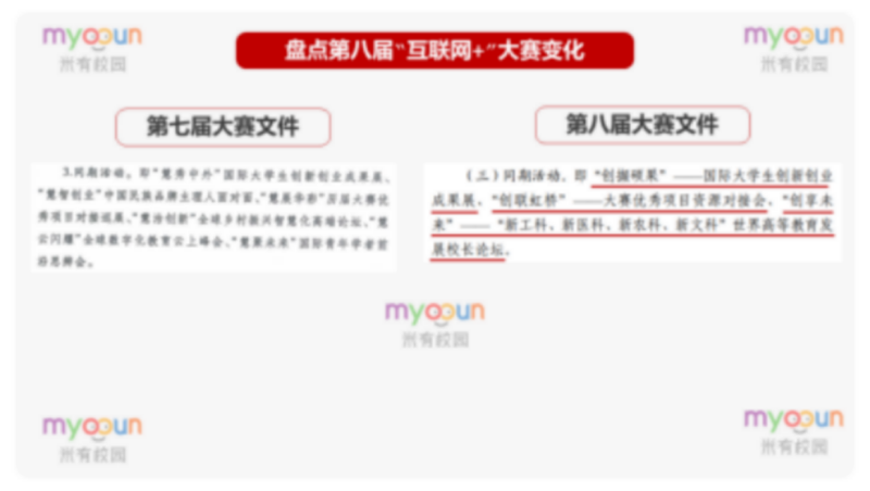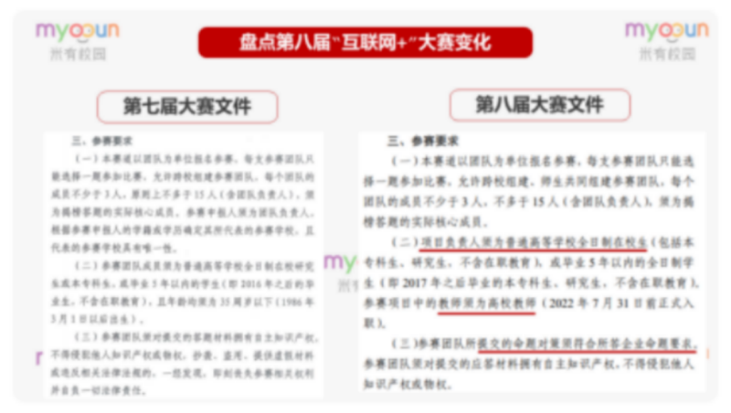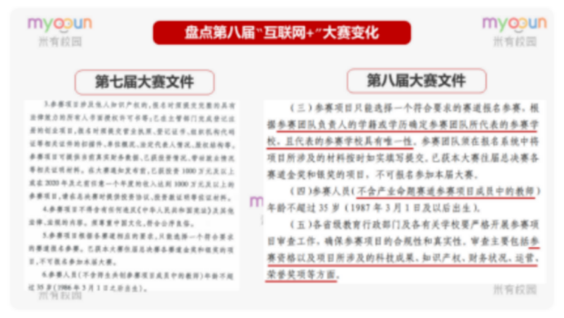以下内容结合米有校园专家团(往届省/国赛专家)意见,整理了第八届“互联网+”大赛的63处变化合集,现全部分享给大家,建议大家收藏好,方便备赛中随时可查!
