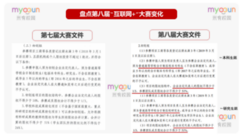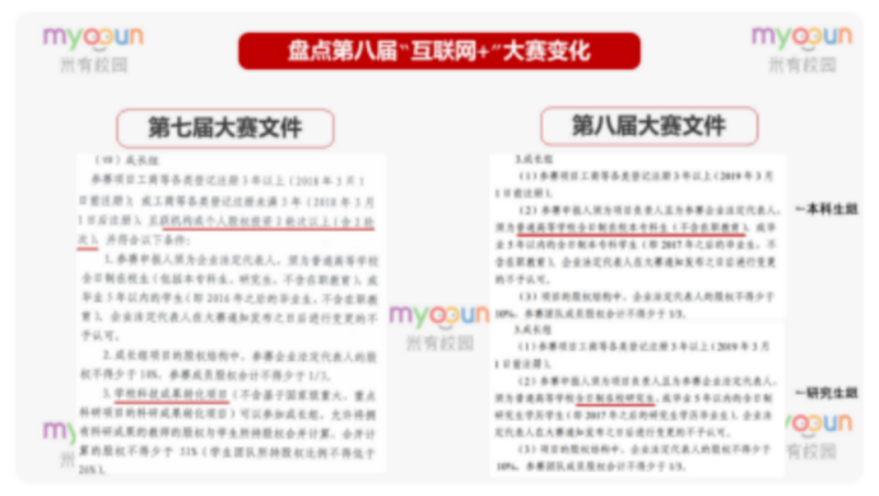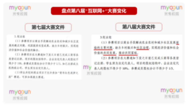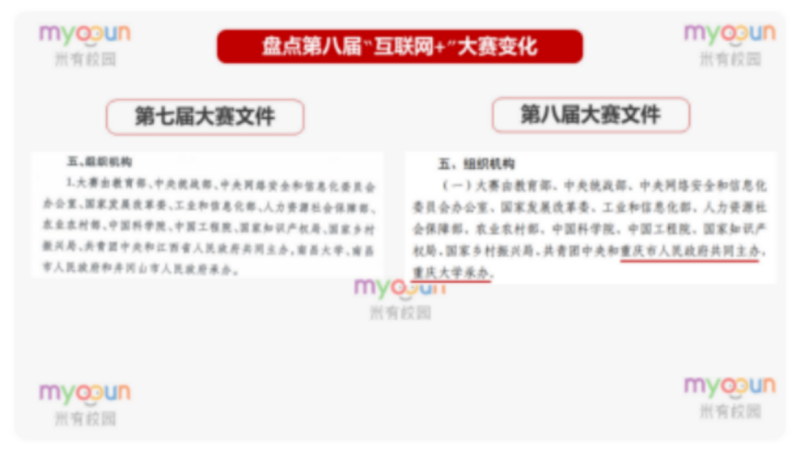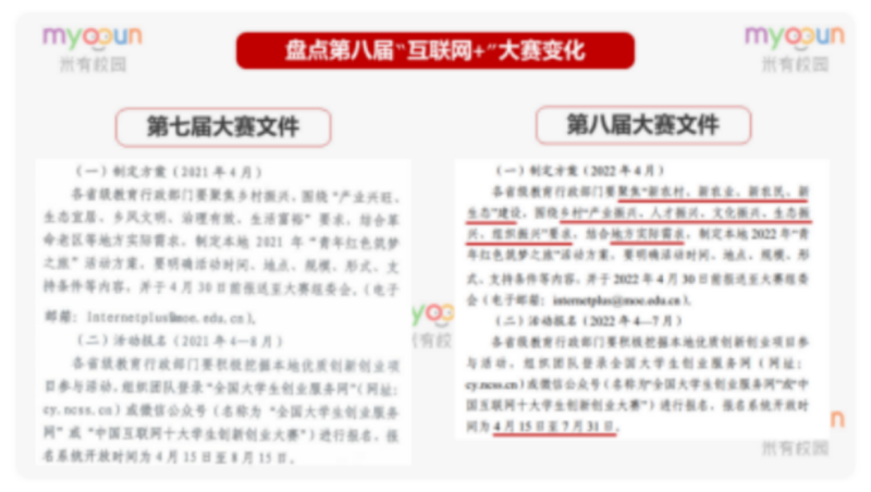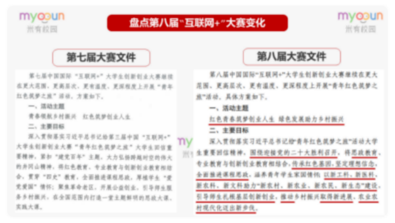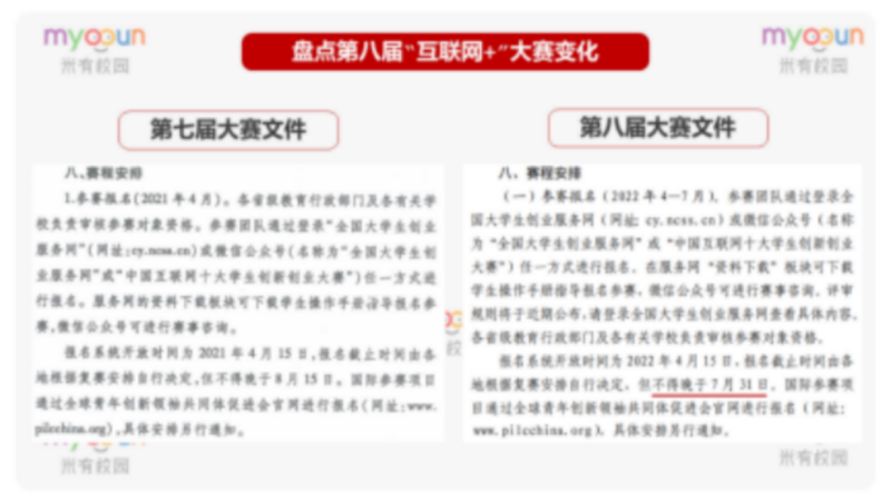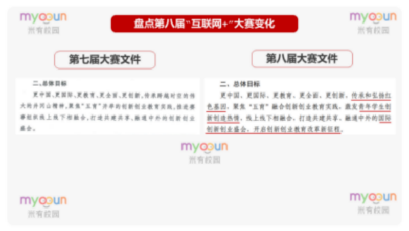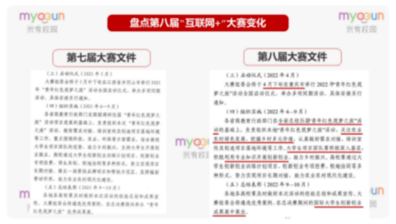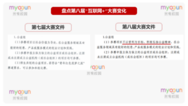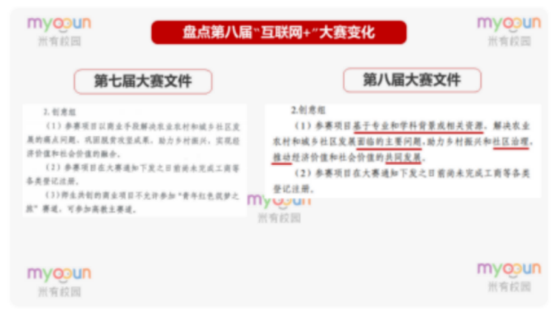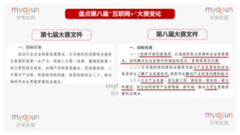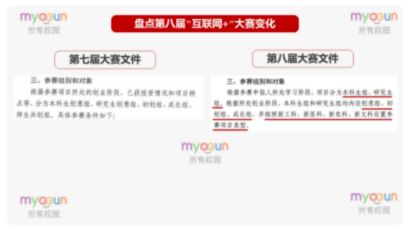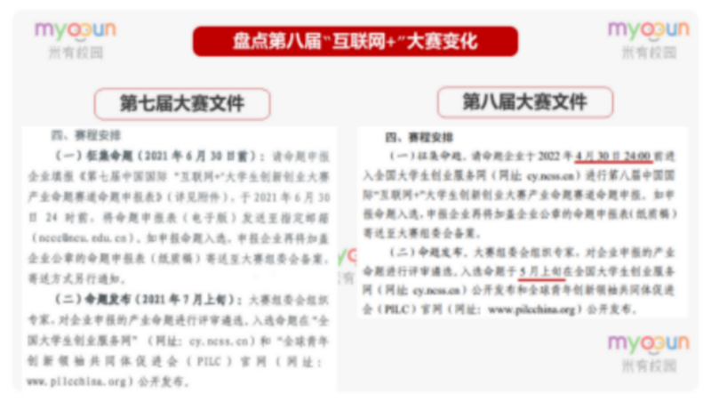 以下内容结合米有校园专家团(往届省/国赛专家)意见,整理了第八届“互联网+”大赛的63处变化合集,现全部分享给大家,建议大家收藏好,方便备赛中随时可查!