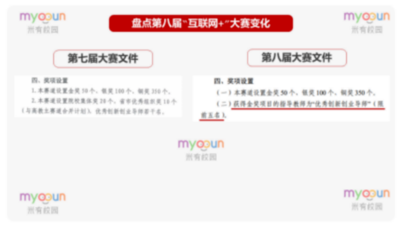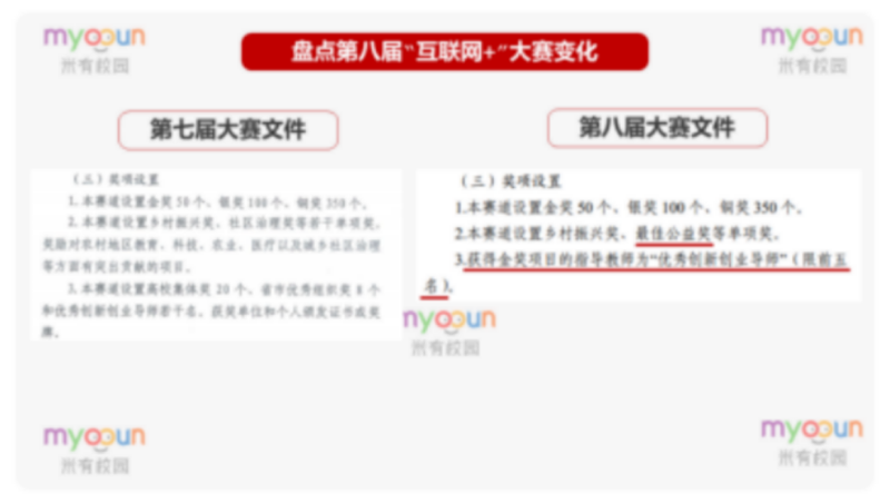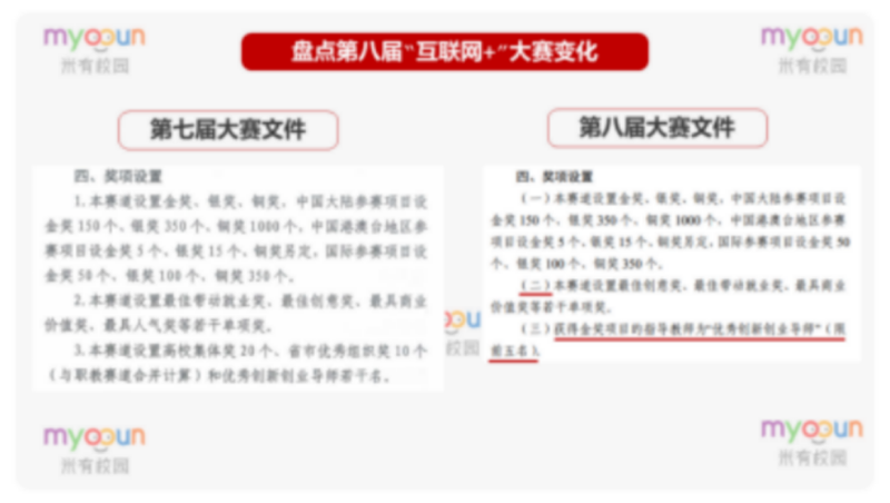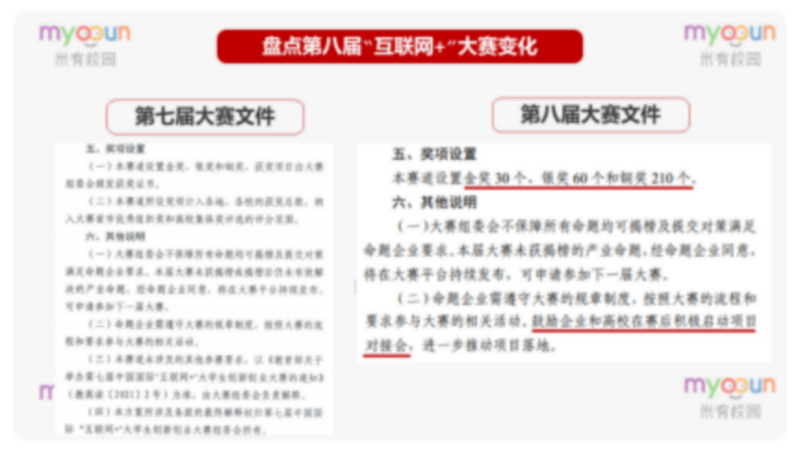 →金奖增至30个,银奖增至60个,铜奖增至210个;以上内容仅为第八届大赛的主要变化,米有校园通过逐字对比两届大赛通知文件,发现还有很多值得各高校师生关注的大赛变化,对大家备赛有重要参考价值