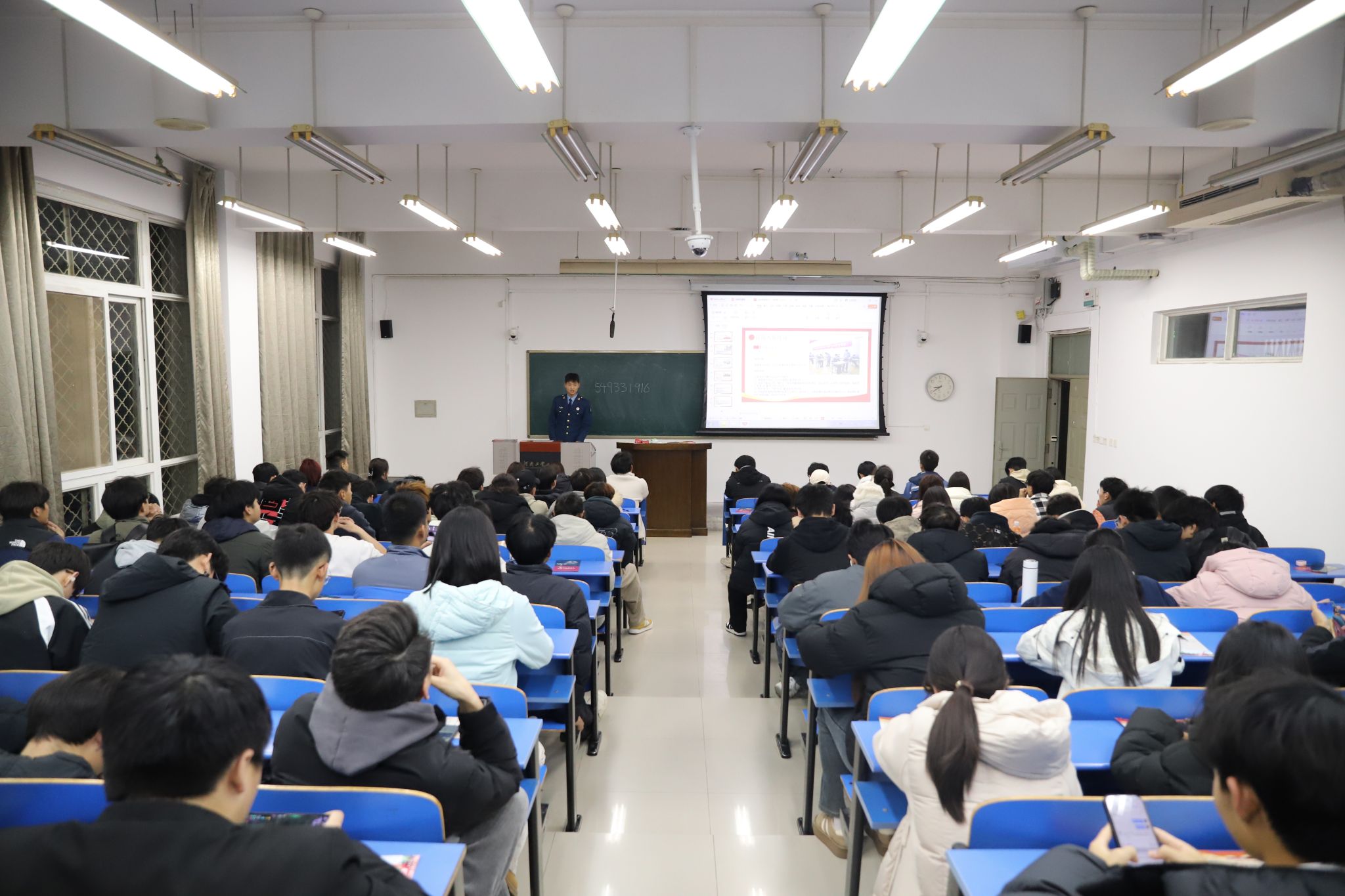 优秀退役复学同学孙旸坤为大家讲解征兵政策,分享军营生活。本次宣讲会共有120余名同学参加。