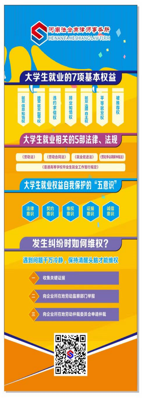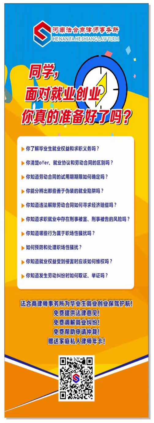 三、河南法合商律师事务所赠送毕业生家庭私人律师年卡一张。就业事关基本民生、经济发展和社会稳定大局,做好大学生就业过程中的法律援助目的在于打造公平的就业环境,形成和谐的劳动关系,推动实现更加充分更高质量的就业。为更好更及时的服务大家,请有需要的毕业生关注微信公众号“法合商律所”,并扫描二维码加入企业微信群聊。