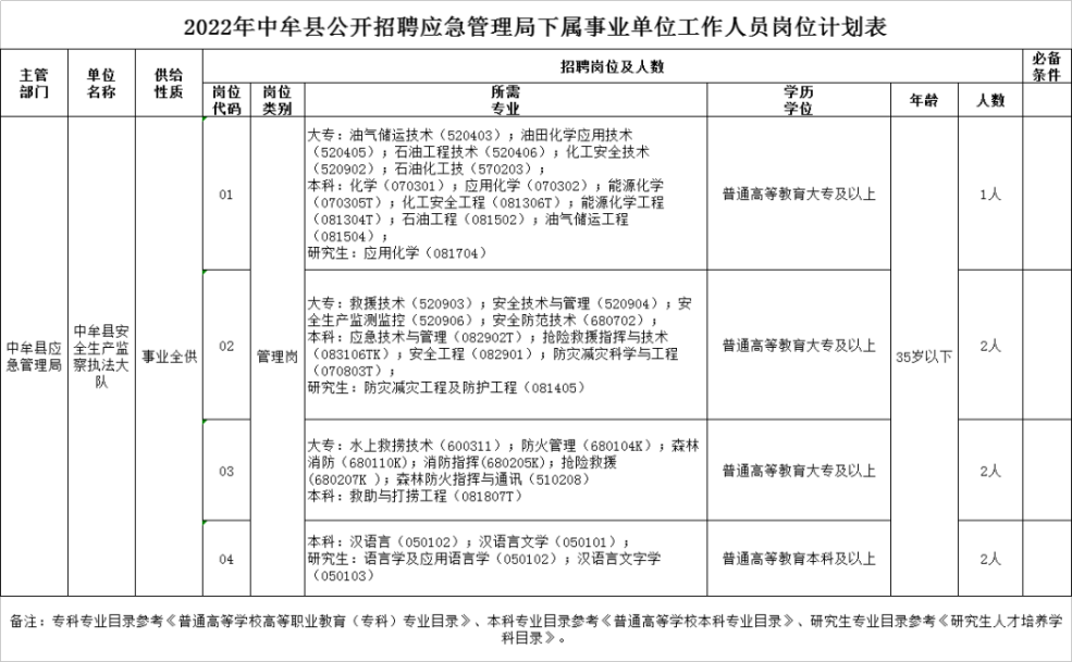 中牟县应急管理局下属事业单位中牟县安全生产监察执法大队共招聘工作人员7名。专业岗位需求、资格条件、计划人数等情况详见《2022年中牟县公开招聘应急管理局下属事业单位岗位计划表》(附件1)。