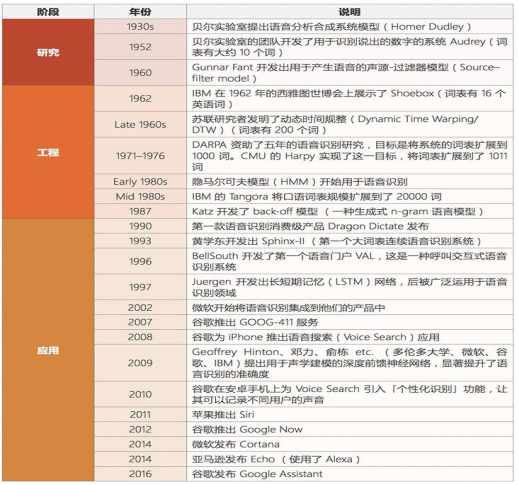 语音识别是指识别语音并将其转换成对应文本的技术。相反的任务即文本转语音也该领域内一个类似的研究主题。语音识别已经处于应用阶段很长时间了。最近几年,随着大数据和深度学习技术的发展,语音识别进展颇丰,现在已经非常接近社会影响阶段了。下图为语音识别领域的发展历程。